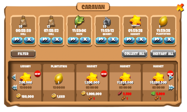 Buy basic materials and cooking ingredients with coins. Sell coins and (leftover) materials for Experience, helping you to level up faster. Selling materials costs 1 ticket per caravan. Tickets available in sales and in the shop for 35 . You get 150% more experience via caravans than Pillars.
