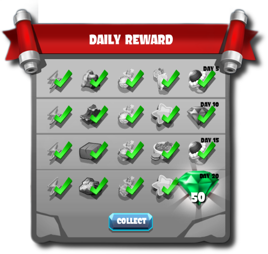 Daily login gifts. 25 & 50 gems every 20 days. |