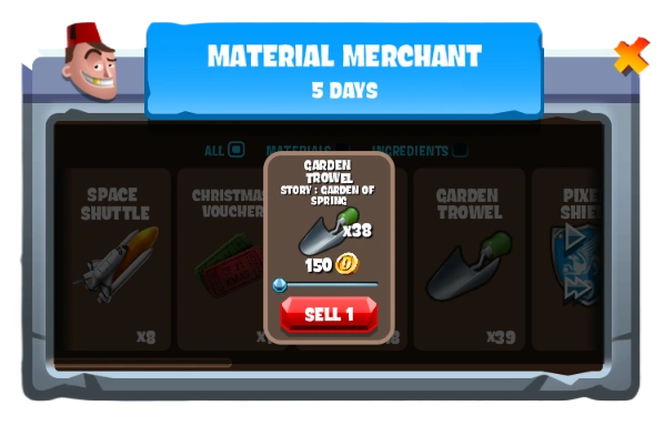 The Material Merchant allows you to exchange your old leftover event materials and ingredients for coins.