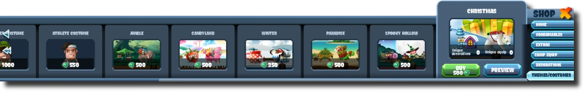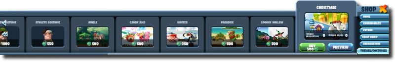 All shop-themes except Christmas 2016 offer cheap equipment, often for coins.